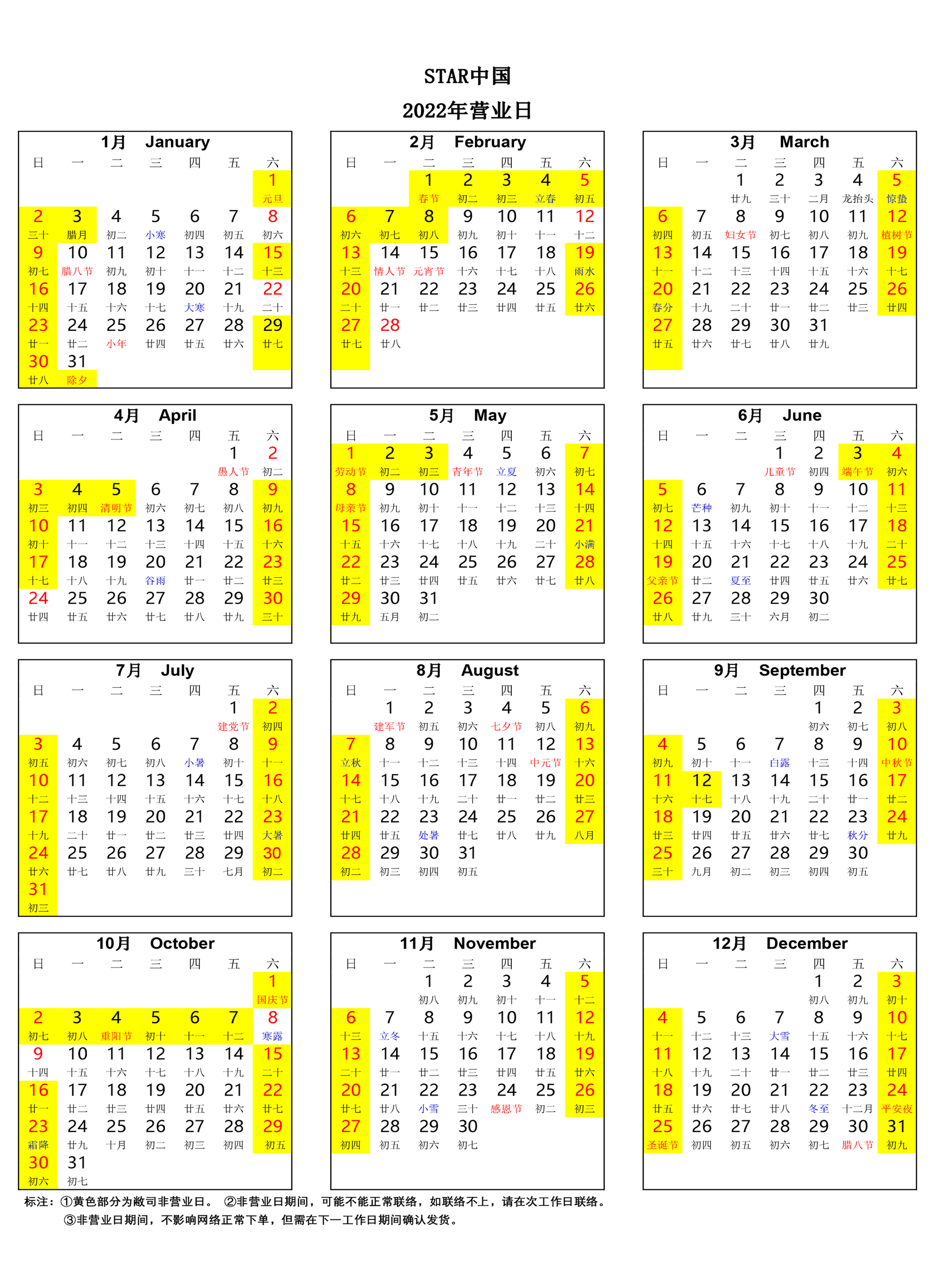 • 如下假期表中黄色填充部分是表示敝司的休息日。